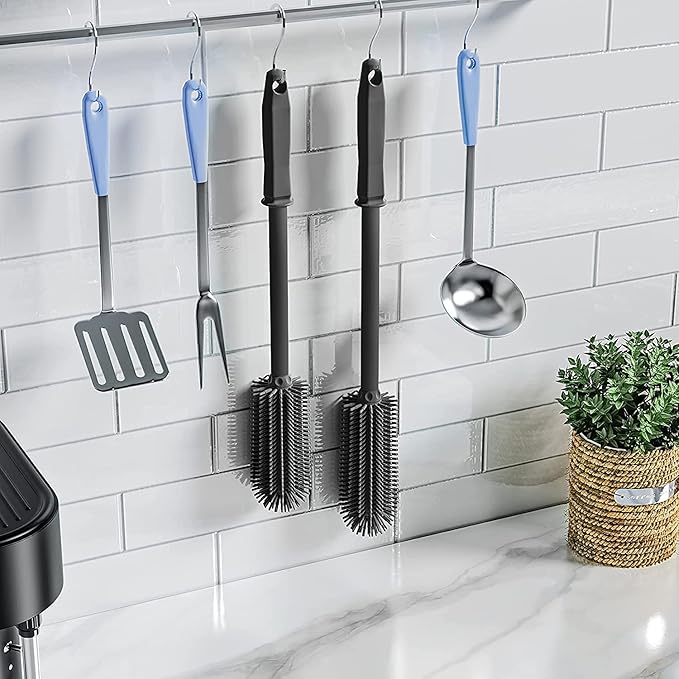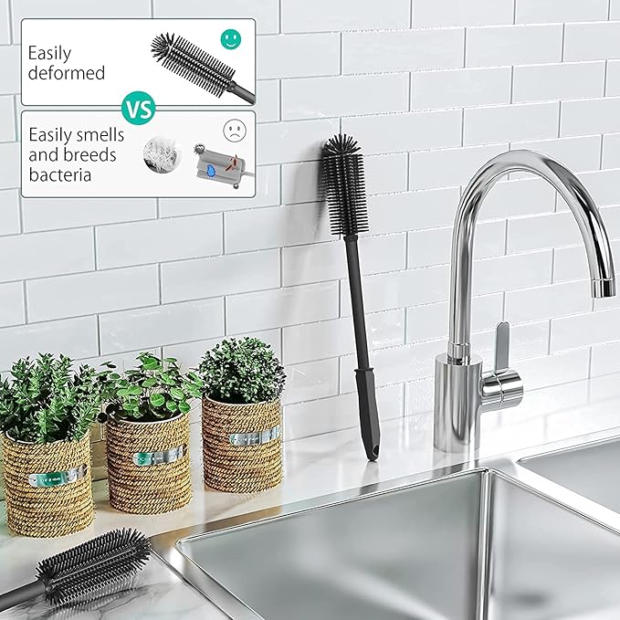 - 【Silicone Bottle Cleaner Brush】2 piece set, included 16" long silicone bottle brush and 13" short silicone bottle brush. With this dynamic duo, you can effortlessly tackle dirt on bottles of all shapes and sizes. Crafted from high-quality silicone, these bottle brushes are safe and reliable for your cleaning needs