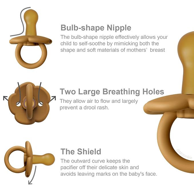 - Stylish Pacifier and Ideal Gift for Baby Shower-With scalloped edges that mimic flower petals, the Moonkie Daisy pacifier takes the thoughtful design of our classic pacifier and adds in a whimsical, charming design. Moonkie newborn pacifiers provide you with a wide variety of earthy tones. You can perfect match your baby's various styles of clothing and pacifier clip. In addition, our pacifiers with exquisite packaging is a perfect gift for baby shower.
