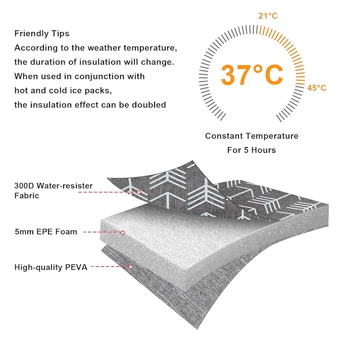 • HIGH QUALITY MATERIALS: This bottle cooler bag is made of high quality water-resistant 300D composite oxford fabric, 8mm extra-thick EPE foam and food-grade PEVA, non-toxic and food safe. Insulated lining can keep bottles cool or warm, it is a perfect breastmilk cooler tote bag for nursing mom.