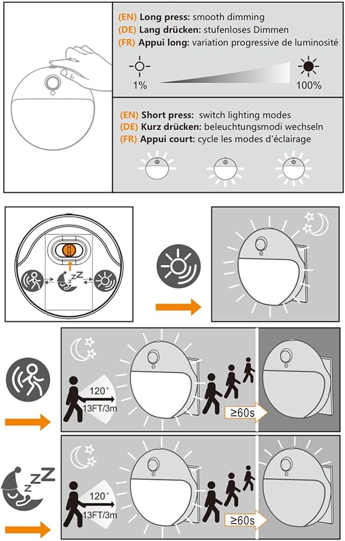 - Owl Mode: The brightness of the motion sensor night light increases by the main light and backlit both on when movement is detected. It decreases to low light by the main light off after 60 seconds of stillness. This automated mode is ideal for hallways, bathrooms, and kitchens where you desire both automatically increased illumination and decreased light.