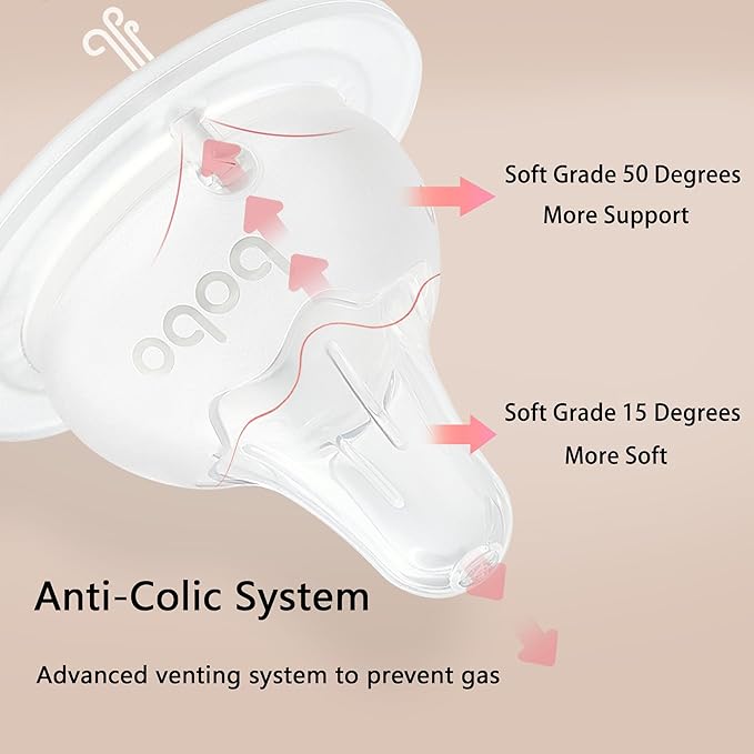 - Anti-Colic System: The bottom of the nipples has intelligent pressure regulating valve, balance internal and external pressure, milk and air separation, to avoid the baby breathing too much air caused by colic flatulence.