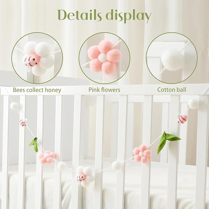 Baby Mobile for Crib, Crib Nursery Mobile for Boys Girls, Boho Bee Flower Nursery Decor Soothe Toy Baby Shower Set for Infant Bedroom Hanging Decoration Toy, Pink