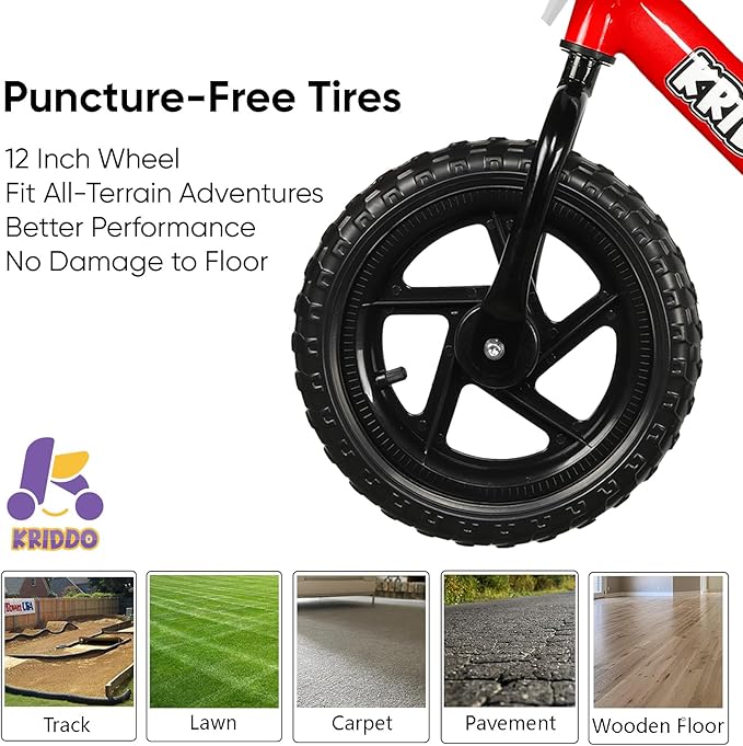 - EXTRA-THICK ALL-TERRAIN TIRES – We want kids to feel strong and stable when they’re moving on grass and sidewalks which is why we added puncture-resistant tires to the front and back of each balance bike for 3-year old’s and 18-month-old riders.