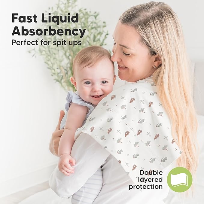 - Super Absorbent, Catches Liquid Well - These burping cloths for babies sits on your shoulder comfortably, and the thick organic cotton catches rolling liquid and spit ups well.