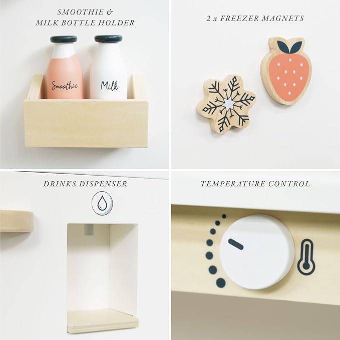 - ALLOWS LONG LASTING FUN, WHILST CARING FOR THE PLANET - This beautifully hand crafted two compartment fridge comes with a host of accessories, including ice creams, ice cubes, egg tray, milk bottle, smoothie bottle and two magnets. All made from sustainable, well managed forests