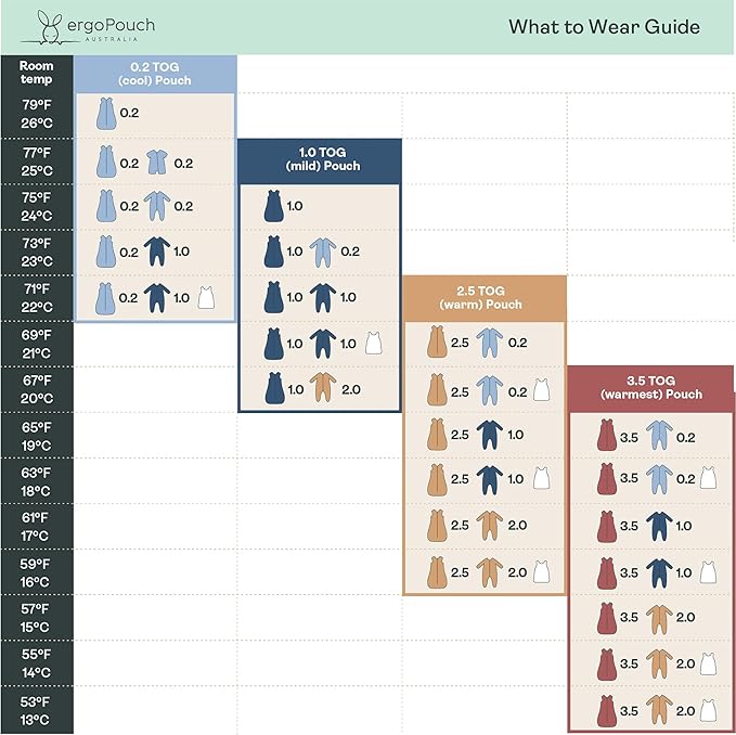 - Choose the Right TOG for Safe Sleep: Temperature-matched for year-round comfort with 4 TOG ratings (warmth levels): 0.2 TOG (71 °F +/ 22 °C +), 1.0 TOG (67–75 °F / 20–24 °C), 2.5 TOG (59–69 °F / 16–21°C), and 3.5 TOG (53–65 °F / 13–19 °C). Eliminates loose blankets while maintaining the temperature for safe sleep. Refer to our What to wear guide for safe dressing options.