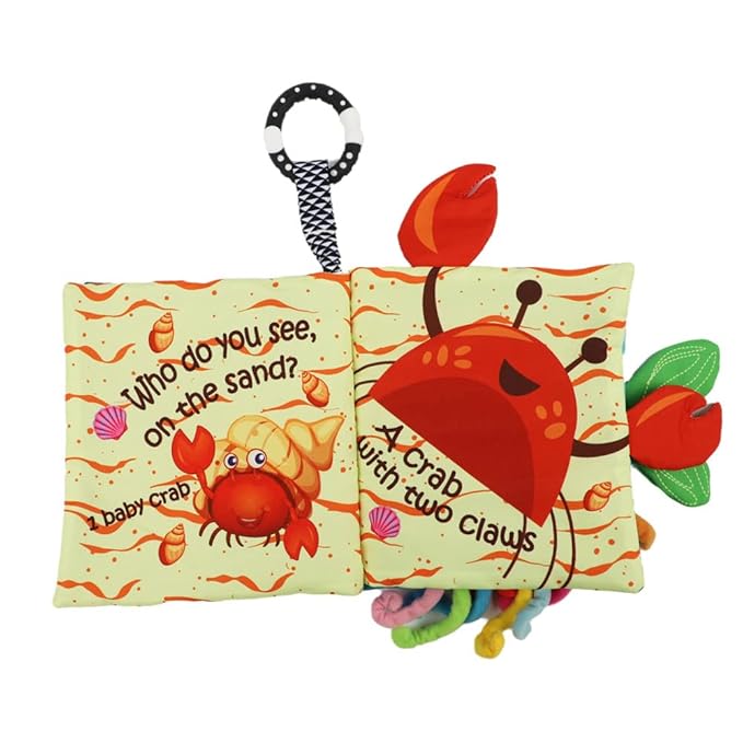 - Baby Books 0-6 Months, Interactive Activity Fish Book: Be a child once again! Lift-the-flap,play peek-a-boo, Search for hidden surprises in the crinkle books,Touch and feel textures,gaining self-awareness & discovery through baby mirror toy & enjoy crinkle pages! This baby toys 3-6 months, soft fabric book encourages adventure & discovery of the colorful undersea world.Your baby will be attracted by 3D baby octopus toy,sea animal,baby crab & fishy tails.You can watch her/his little eye’s dance!