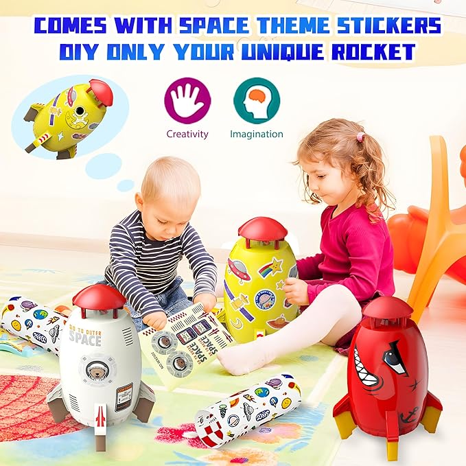- 🚀【DIY spray rocket toy】: In this children's spray toy, you will get a rocket that has not been designed and some beautiful stickers. You can design your favorite styles with your children. This is a toy that can spray water in the air to bring cool and refreshing for children, so that children can also play with water happily at home.