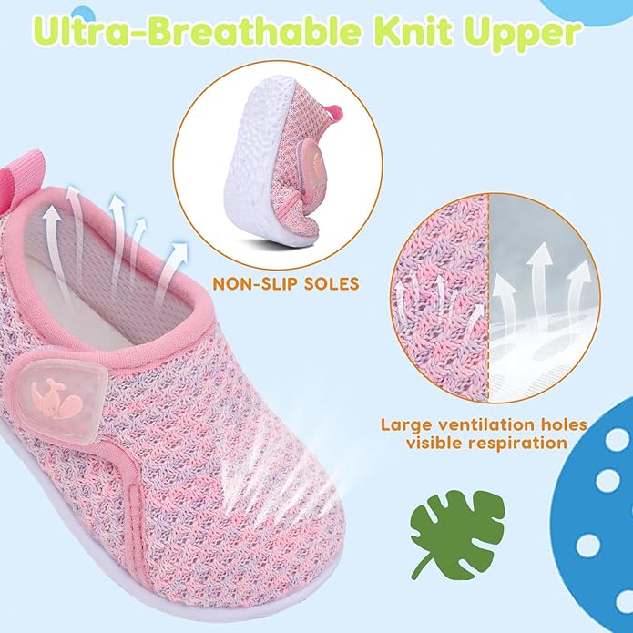 • Upper:Knitted Mesh Upper offers comfort and air permeability,has excellent breathability,moisture wicking function,and keep baby's feet dry and odorless.Super Soft,Breathable and Comfortable fit all the year