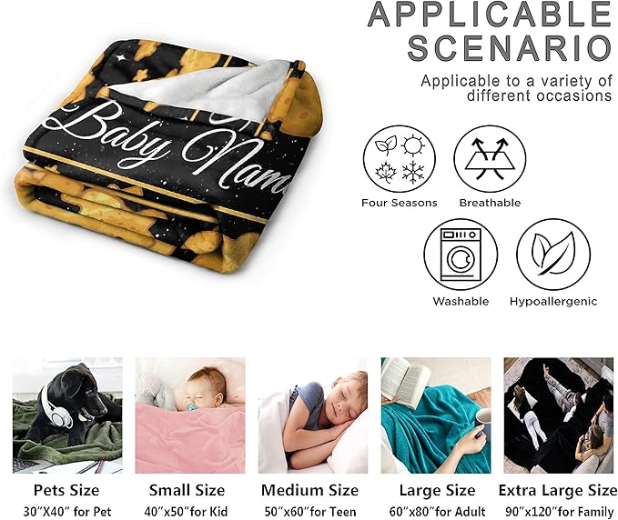 • 【Soft Flannel Blankets】 Personalized throw blankets are made of premium anti-pilling flannel, soft to touch, warm to cover. Hand and machine washable, it will not shrink or fade. 5 size available: 30"x 40", 40"x 50", 50"x 60", 60"x 80",90"x 120". Perfect Custom Name blankets for baby, kids, teenager, adult,Family.