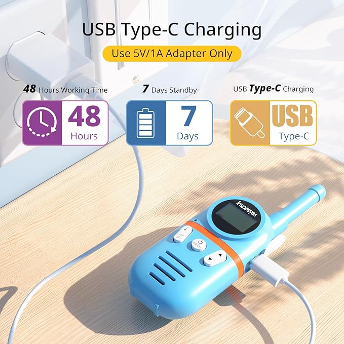 - Inspireyes rechargeable kids walkie talkies are rechargeable and long lasting, featuring an upgraded built-in lithium polymer battery. There is no need to buy extra AAA batteries. Kids can enjoy up to 48 hours of playtime and 7 days of standby on a single charge.