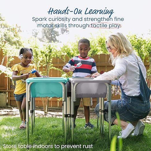 - Indoors and Outdoors: Play tables can be used in the backyard, outdoor play area, classroom, playroom; cover basins with secure lids to keep contents dry; bring tables inside to prevent rust