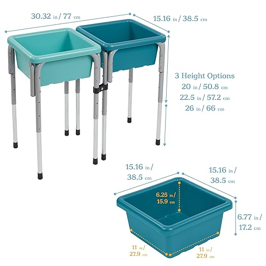 - Product Dimensions: Table 30.32" W × 15.16" D and can adjust to three heights: 20”, 22.5” or 26" H; bins hold approximately three U.S. gallons; Adult Active Engaged & Direct Supervision Required