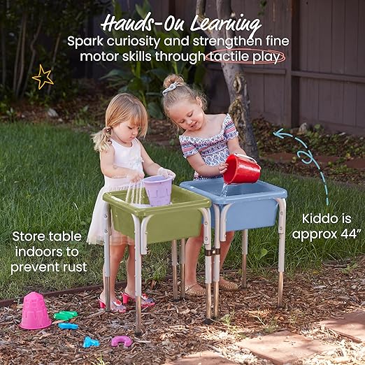 - Indoors and Outdoors: Play tables can be used in the backyard, outdoor play area, classroom, and playroom; cover basins with secure lids to keep contents dry; bring tables inside to prevent rust