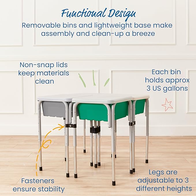 - Product Dimensions: Table measures 30.32" W × 30.32" D and can adjust to three heights: 20”, 22.5” or 26" H; bins hold approximately 3 U.S. gallons; Adult Active Engaged & Direct Supervision Required