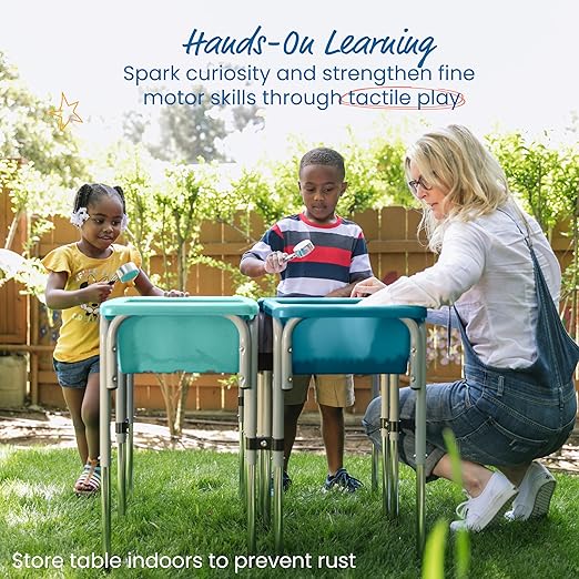 - Indoors and Outdoors: Play tables can be used in the backyard, outdoor play area, classroom, playroom; cover basins with secure lids to keep contents dry; bring tables inside to prevent rust