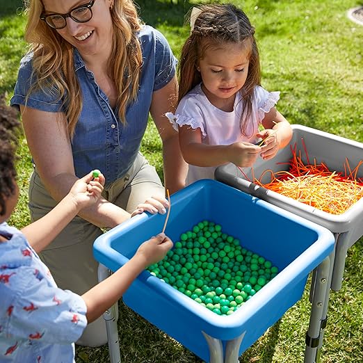 - Indoors and Outdoors: Play tables can be used in the backyard, outdoor play area, classroom, and playroom; cover basins with secure lids to keep contents dry; bring tables inside to prevent rust