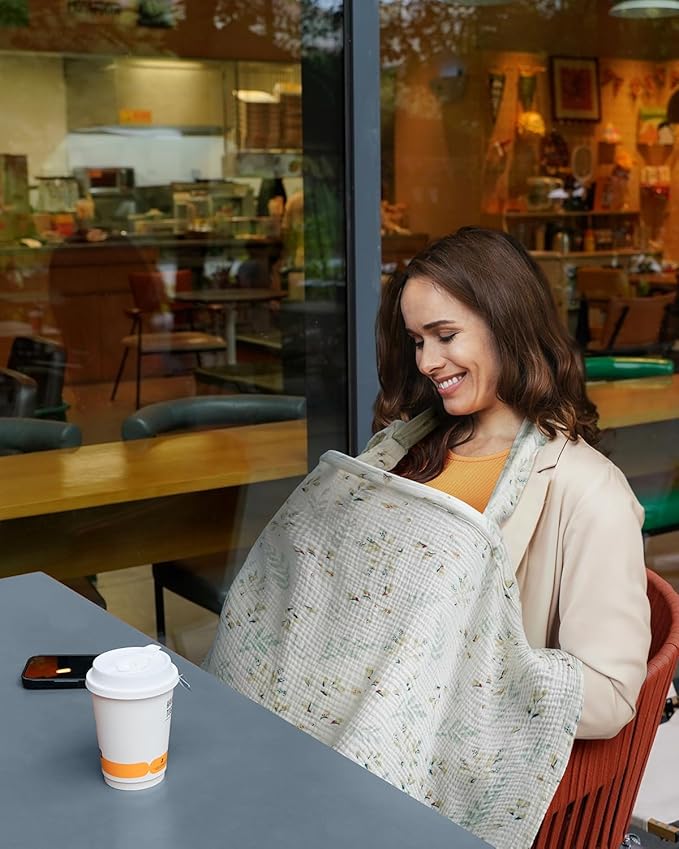 Blissful Diary Muslin Nursing Cover for Breastfeeding, Breathable Breastfeeding Cover up with Arch Neckline for Women, Nursing Apron (Botanical Leaf)