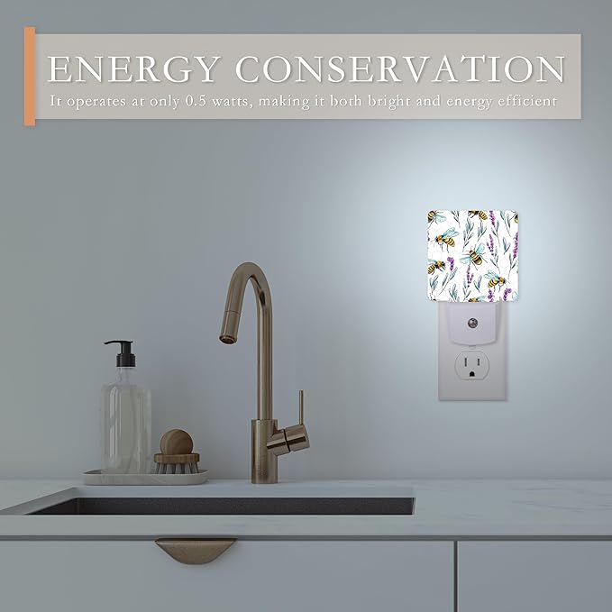 Night Light With Bees and Lavender Flowers - Dusk to Dawn Sensor for Kids, Girls, Boys, Women, Men - Room Decor for Hallway, Kitchen, Bathroom, Nursery, Stairs