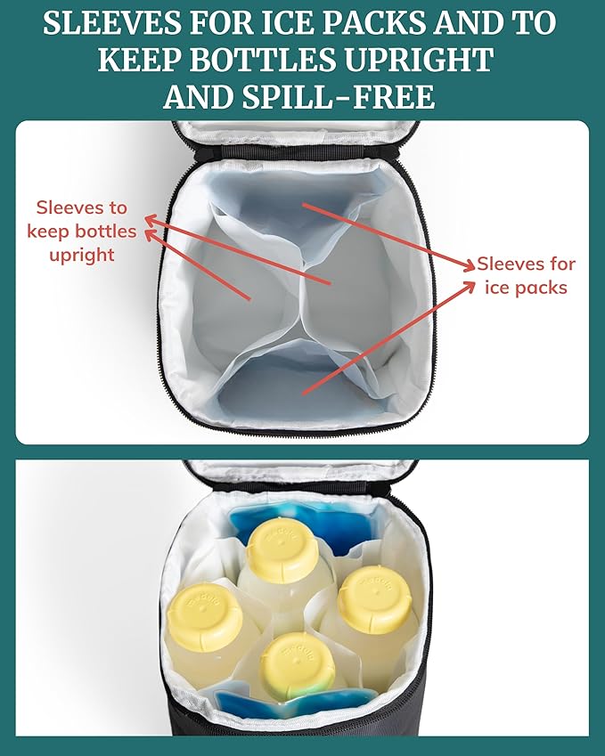 - Easy to Use and Clean – Convenience Encased in Style: Simply place your bottles and ice packs into the designated holders and zip up the case. The front and back slip pockets securely hold ice packs, keeping your milk chilled. After use, wipe down the interior and exterior with ease. Includes two PEVA sleeves to keep bottles upright and prevent spills.