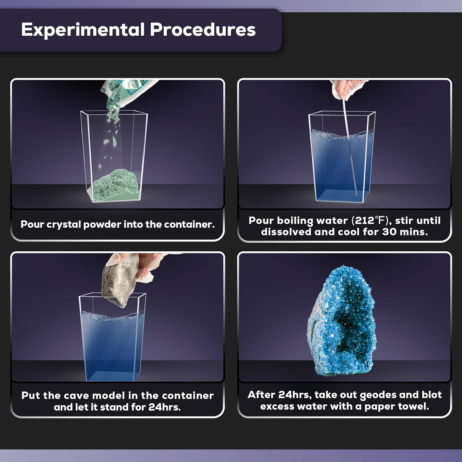 - 24Hrs Rapid Growth: The science kit for kids offers a 24Hrs journey of wonder,within a day, children will witness stones transforming into beautiful crystal clusters; It comes with guided instructions for anyone looking for how to start