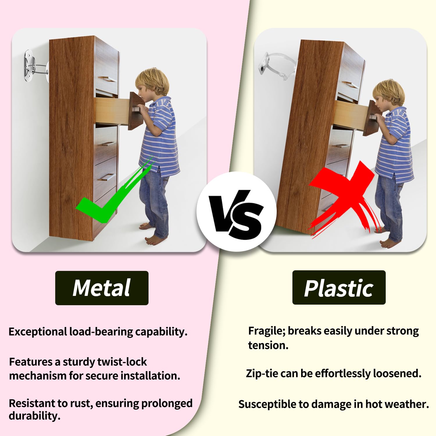 - Premium Material: Crafted from high-quality stainless steel, our baby-proof furniture anchors offer exceptional corrosion resistance and long-lasting defense against rust. Resilient against fire and heat, these anchors surpass plastic alternatives in durability, making them the ultimate guardian for your baby's safety.