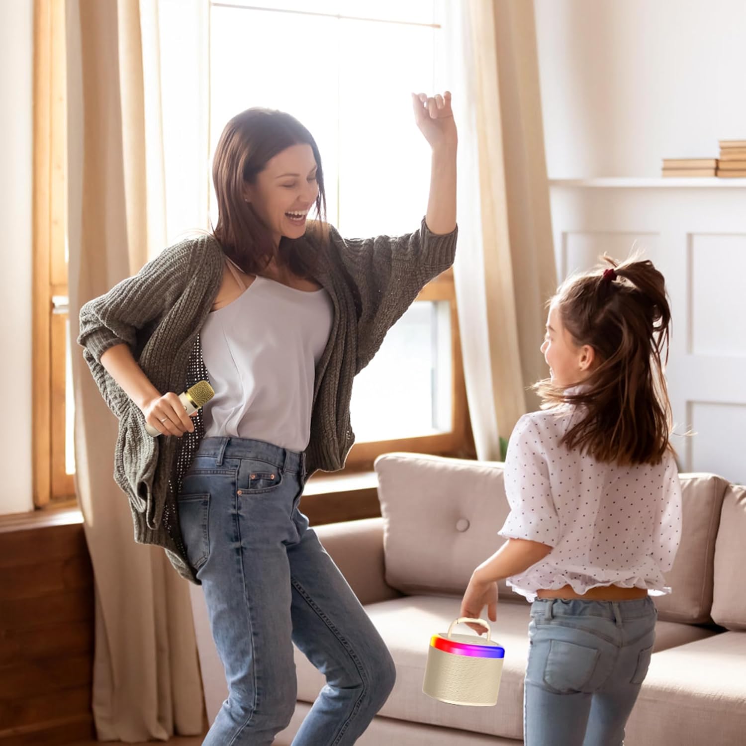 - ♪【Funny Voice Change & LED Lights】With 4 kinds of magic sound, including original, KTV, monster and felmale voice,this Bluetooth party speaker is providing endless fun for kids. Get the party started with our karaoke machine, enhanced with dynamic dancing lights that infuse your party with joy and energy.