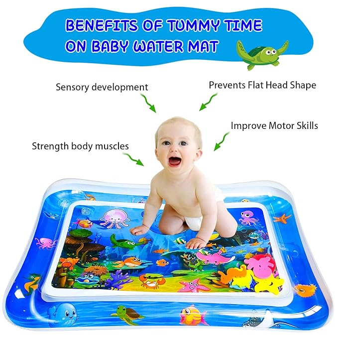 - 【Baby Water Mat and Safe】: The baby water play mat is made of BPA-free PVC materials that has been thoroughly tested, proved tummy water mat is comfortable soft, inflatable.