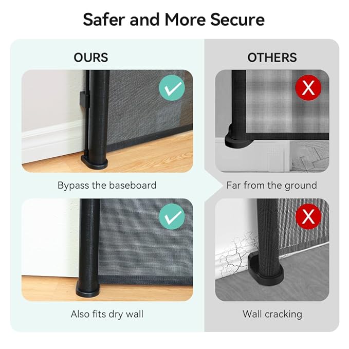 - Secure&Sturdy Baby Gate: No need to worry about sneaky escapes with this safety gate! Its improved design includes 3 floor hooks for solid anchoring. Plus, a rotating knob tightens the mesh door net, preventing sagging and effectively confining young children or pets. Made from high-quality, sturdy mesh, the baby gates extra wide resists warping and wrinkling
