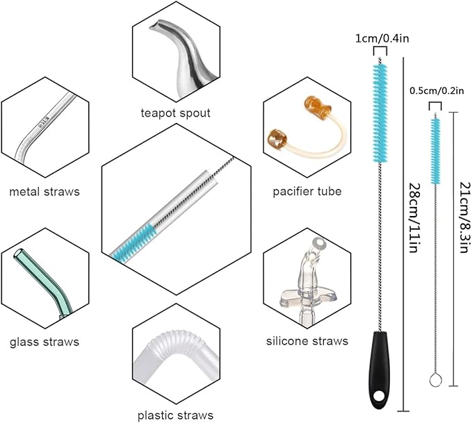 - The stainless steel long-handled water bottle brush features a removable design and one brush head that measures approximately 2 1/2 inches in diameter. The top of the brush handle has a keyhole-like slot into which the brush head can be inserted by sliding the bottom of the brush head into the slot and twisting the brush head to the left to lock it in place. The large straw brush is 10.8 inches/27.5 cm long for easy cleaning of sports water bottle thermos straws, and the small straw brush is 8 inches/20.5 cm long for cleaning and unclogging the microscopic holes in baby bottle straws to keep them clean, hygienic and environmentally friendly.