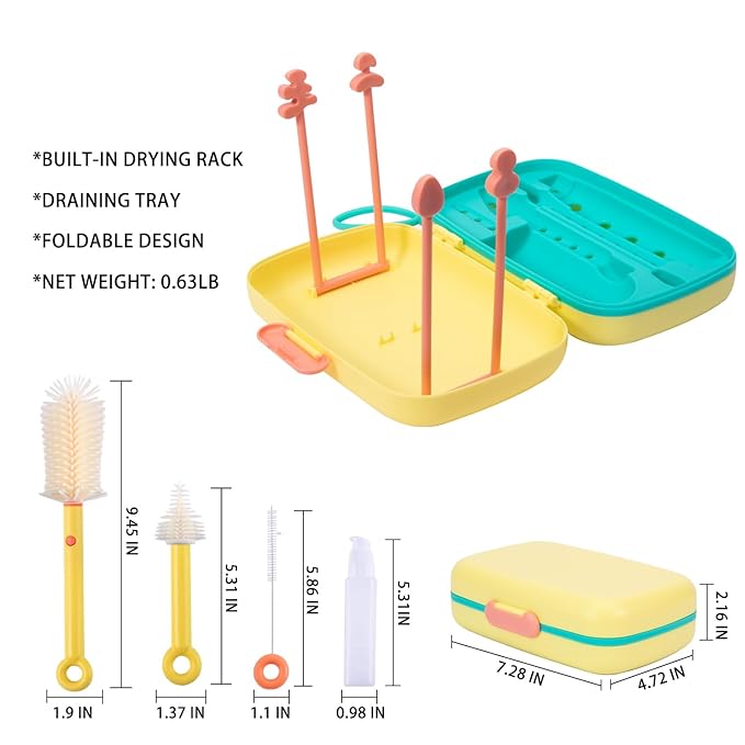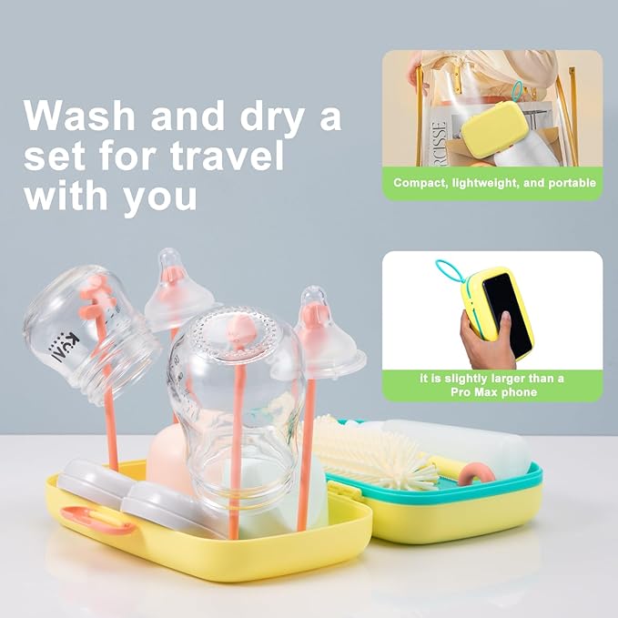 7in1 Travel Bottle Cleaner kit,Baby Essentials, with Bottle Brush、Nipple Brush、Straw Cleaner Brush、Soap Dispenser、Bottle Drying Rack、Drainage Tray、Storage Box,Baby Travel Essential (Yellow)