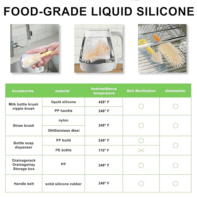 - 𝐘𝐨𝐮𝐫 𝐛𝐚𝐛𝐲’𝐬 𝐡𝐞𝐚𝐥𝐭𝐡 𝐢𝐬 𝐩𝐚𝐫𝐚𝐦𝐨𝐮𝐧𝐭: The BPA-free, odorless, flexible, and durable silicone brush head can be thoroughly cleaned and does not cause any damage to the bottle or nipples. Moreover, the PP materials and smooth-ball contact points do not cause any damage either.