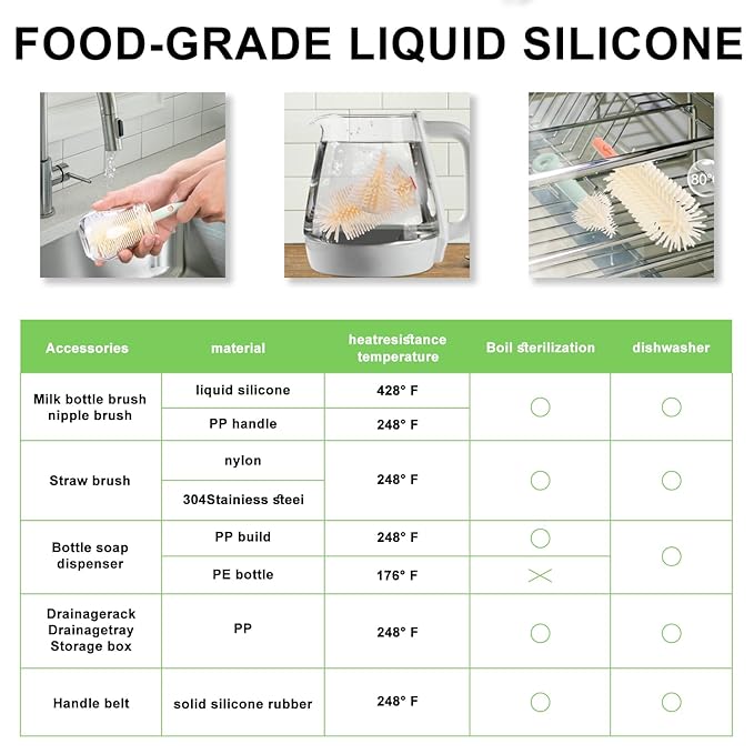 - 𝐘𝐨𝐮𝐫 𝐛𝐚𝐛𝐲’𝐬 𝐡𝐞𝐚𝐥𝐭𝐡 𝐢𝐬 𝐩𝐚𝐫𝐚𝐦𝐨𝐮𝐧𝐭: The BPA-free, odorless, flexible, and durable silicone brush head can be thoroughly cleaned and does not cause any damage to the bottle or nipples. Moreover, the PP materials and smooth-ball contact points do not cause any damage either.