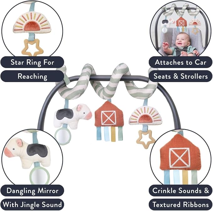 Itzy Ritzy Spiral Car Seat & Stroller Activity Toy - Stroller & Car Seat Toys for Ages 0 Months and Up - Hanging Toys Include Dangling Ring, Mirror and Textured Ribbons (Farm)