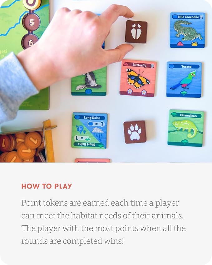 - HOW TO PLAY: Players earn points by choosing animal tiles & placing them next to other tiles that provide the needed components for survival. Tokens are earned each time a player can meet their animals' needs. The player with the most points at the end wins!