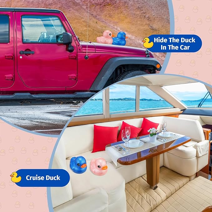 - Package Includes: the package includes 2 pieces of big rubber ducks, one in blue glitter and one in pink glitter; Whether for a birthday party, summer theme party, or as home and bathroom decor, these rubber ducks would add a delightful glow to setting