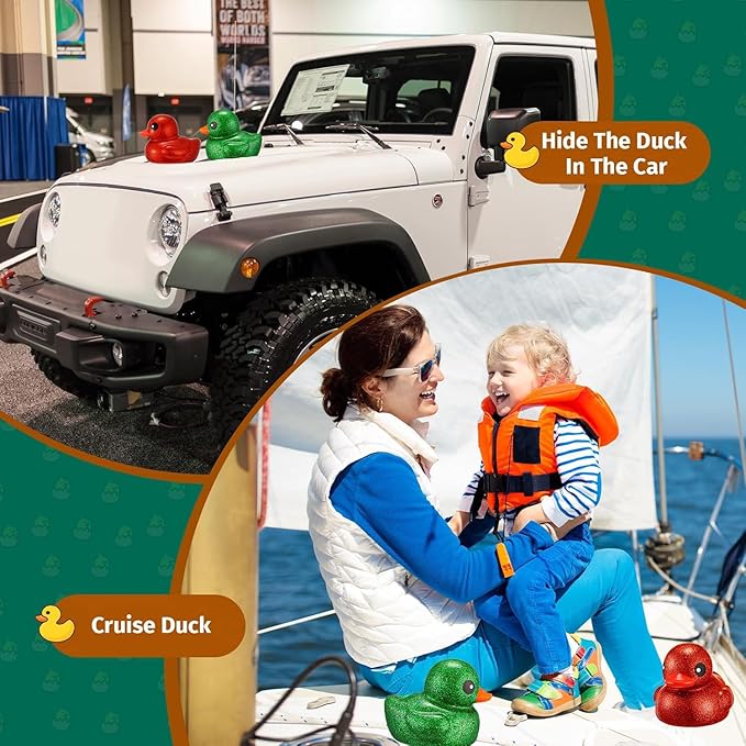 - Package Includes: the package includes 2 pieces of big rubber ducks, one in red glitter and one in green glitter; Whether for a birthday party, summer theme party, or as home and bathroom decor, these rubber ducks would add a delightful glow to setting