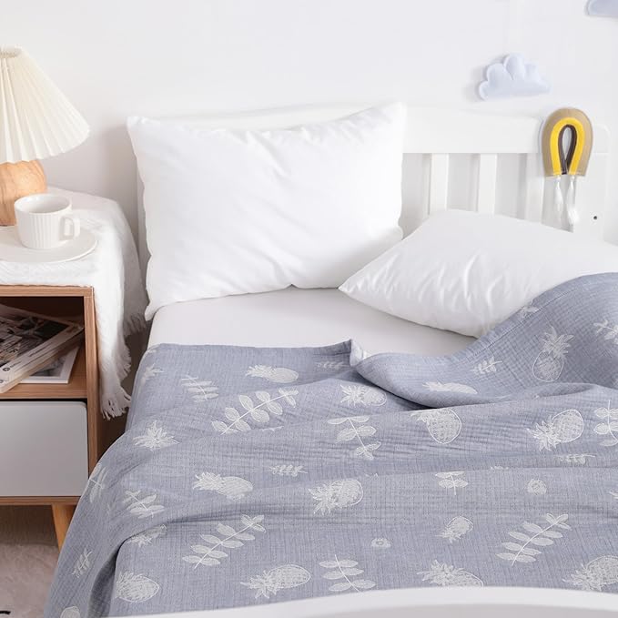 NTBAY 3 Layer Oversized Muslin Cotton Toddler Blanket, 45x60 Inches Jacquard Reversible Nursery Bed Blanket, Super Soft and Thermal Crib Blanket for All Seasons, Baby Gift, 45"x60", Blue Pineapple