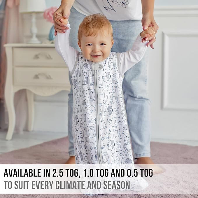 - 【MADE WITH ORGANIC COTTON】— The Mama Cheetah 2.5 TOG Baby Sleeping Bag is made of a premium 100% organic cotton shell with ultra soft polyester fill for extra warmth, which is perfect for cooler months. The organic cotton interlock minimizes overheating and keeps your baby warm and comfortable. Please be mindful of the TOG rating when ordering the right sleeping bag for your baby.