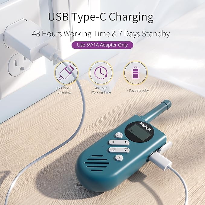 - Type-C Rechargeable, Long-lasting. Rechargeable walkie talkies feature an upgraded built-in lithium polymer battery, no need to pay for AAA batteries anymore, long play time, up to 48 hours working time, 7 days standby.