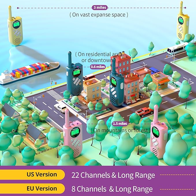 - Clear Sound and Long Range. There are 22 channels of the two-way radios, ensuring 3 miles of wireless communication for plenty of fun. Longer range communication in open areas with little or no obstruction.