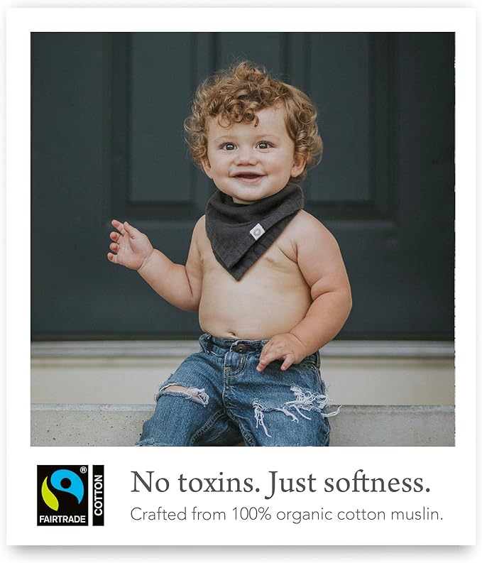 • 100% ORGANIC COTTON MUSLIN, FAIRTRADE CERTIFIED – Every bib is made from Fairtrade-certified organic cotton muslin, supporting better wages, safer working conditions, and dignity for the people who make them. No toxins. No harsh dyes. Just softness with real substance.