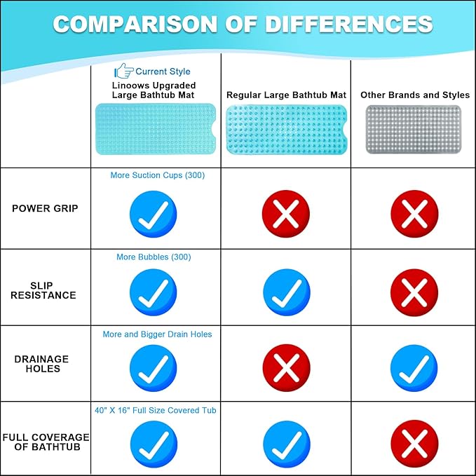 - STRONG GRIP: Linoows premium tub and shower mat upgrade comes with 300 high-strength and flexible suction cups, 30% more suction cups than other ordinary tub mats on the market, and stronger suction to help keep it in place on a smooth clean surface. Our bath mats are a great choice for the home, gym, spa, and more!