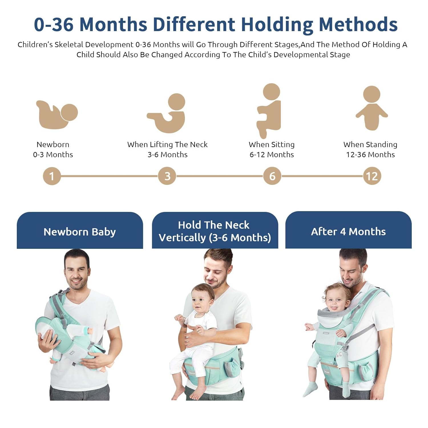 Baby Carrier with Hip Seat, Ergonomic M Position 6in1 Baby Carrier Newborn to Toddler,Head Support and Breathable Mesh Newborn Carrier,Adjustable Baby Holder Carrier for Dad&Mom-Green