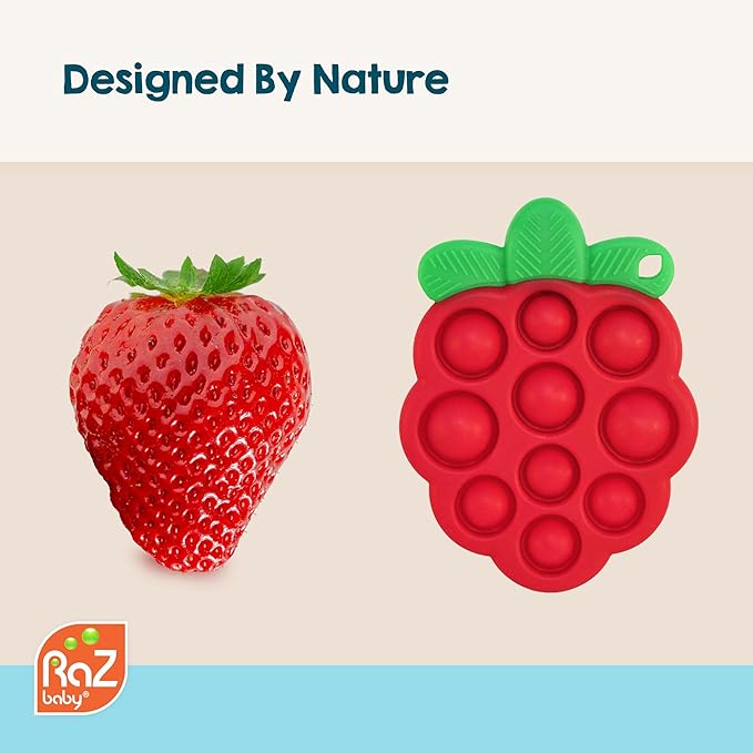 - Sensory Development – The RaZberry Pop Strawberry Teether engages babies 3M+ with its multi-textured silicone design, stimulating touch and taste while soothing sore gums. The poppable feature enhances exploration, promoting oral and motor skill development.