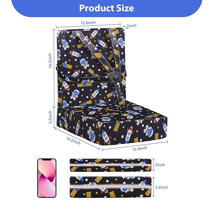 - WIDELY USED: The thickness/ firmness of the cushion and large size means that it works for a variety of ages. Older children can skip getting buckled in and just use the cushioned seat. This versatility ensures that the booster seat can be used with a variety of dining chairs and tables, making it suitable for different households or when dining out. It arrives vacuum packed, expands immediately and recover to its original height within 24-48 hours once you open the plastic