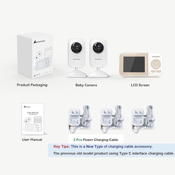 ebemate Video Baby Monitor Camera with 2 Camera,2.8" LCD Screen Video & Audio No Glow Night Vision,2-Way Talk Audio Cam Baby Monitoring 1200FT Range EBE28-2