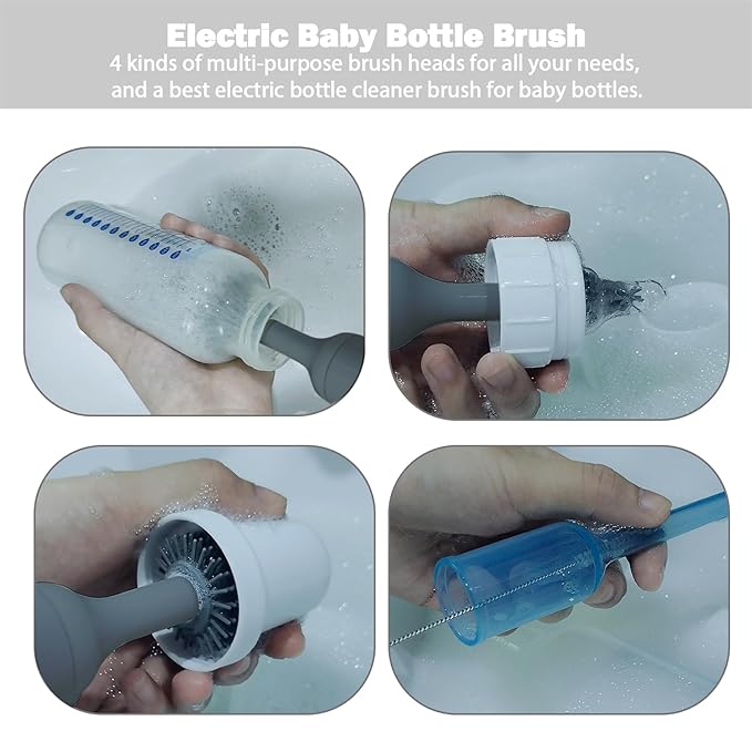 Electric Baby Bottle Brush Set with Rechargeable Electric Bottle Brush Cleaner and Replaceable Silicone Bottle Brushes and Straw Brush Cleaner, Waterproof Multi-Purpose Cleaning Brush(Grey)
