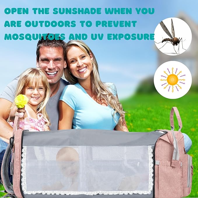 - 【DIAPER CHANGING STATION】This diaper bag is more than just a simple backpack. It provides you with a safe and hygienic area to change diapers when needed or a comfortable place for your baby to rest. If your child needs to take a nap while out and about, the mattress and pillow ensure a comfortable and safe environment for you, with a sunshade to protect their eyes.