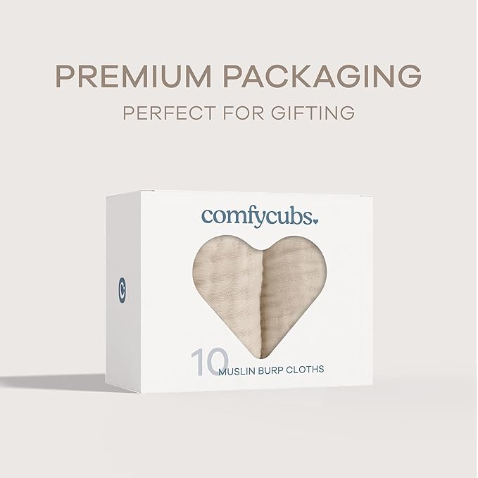 Comfy Cubs Muslin Burp Cloths 20" x 10", Pack of 10 - Large, 6-Layer, Ultra Absorbent 100% Cotton for Baby Drool and Messes - Soft, Safe & Gentle Baby Burp Cloths for Boys & Girls - Sand